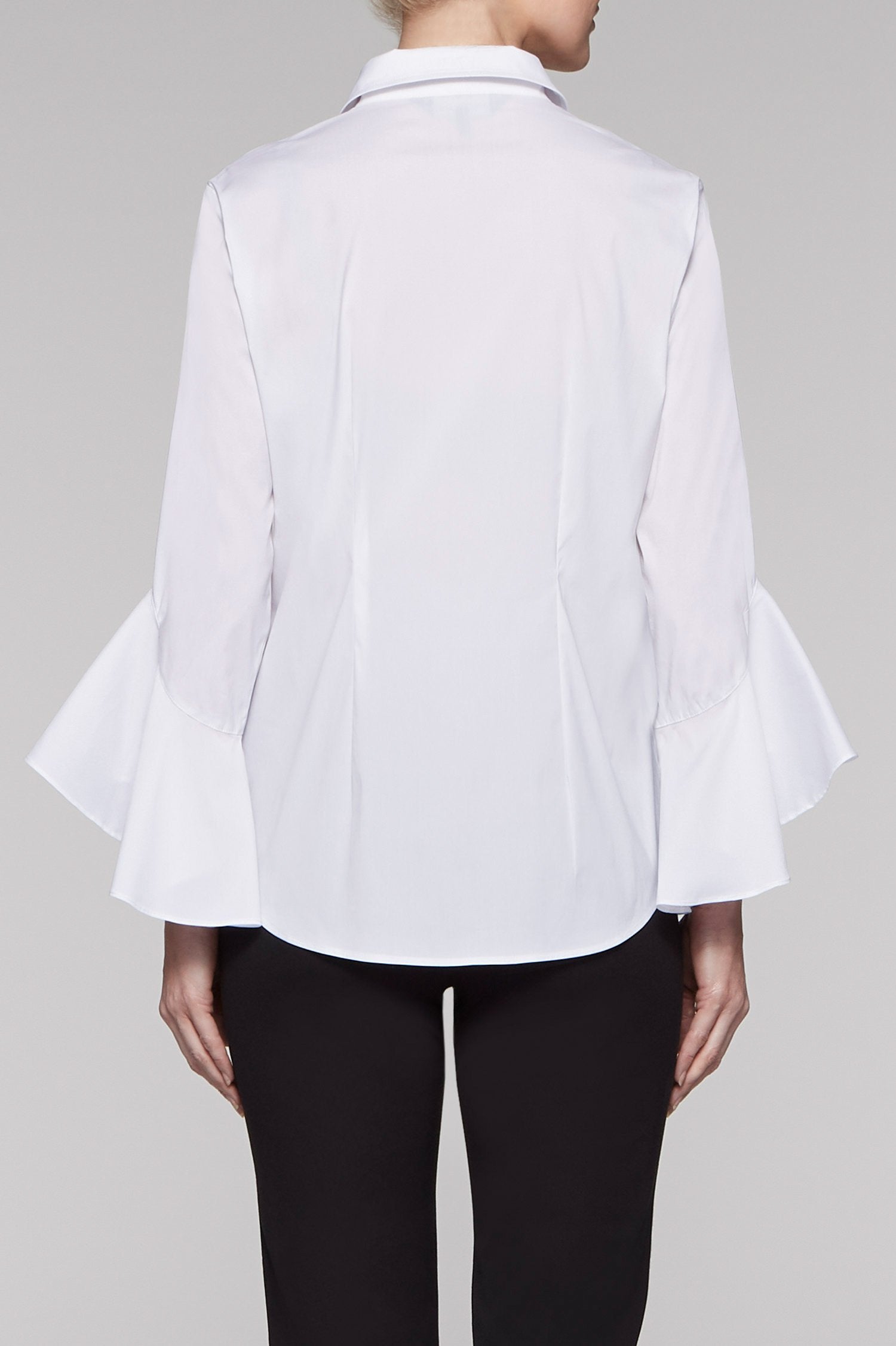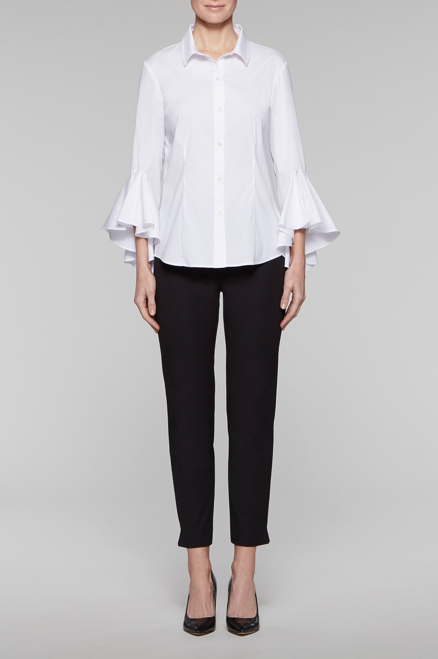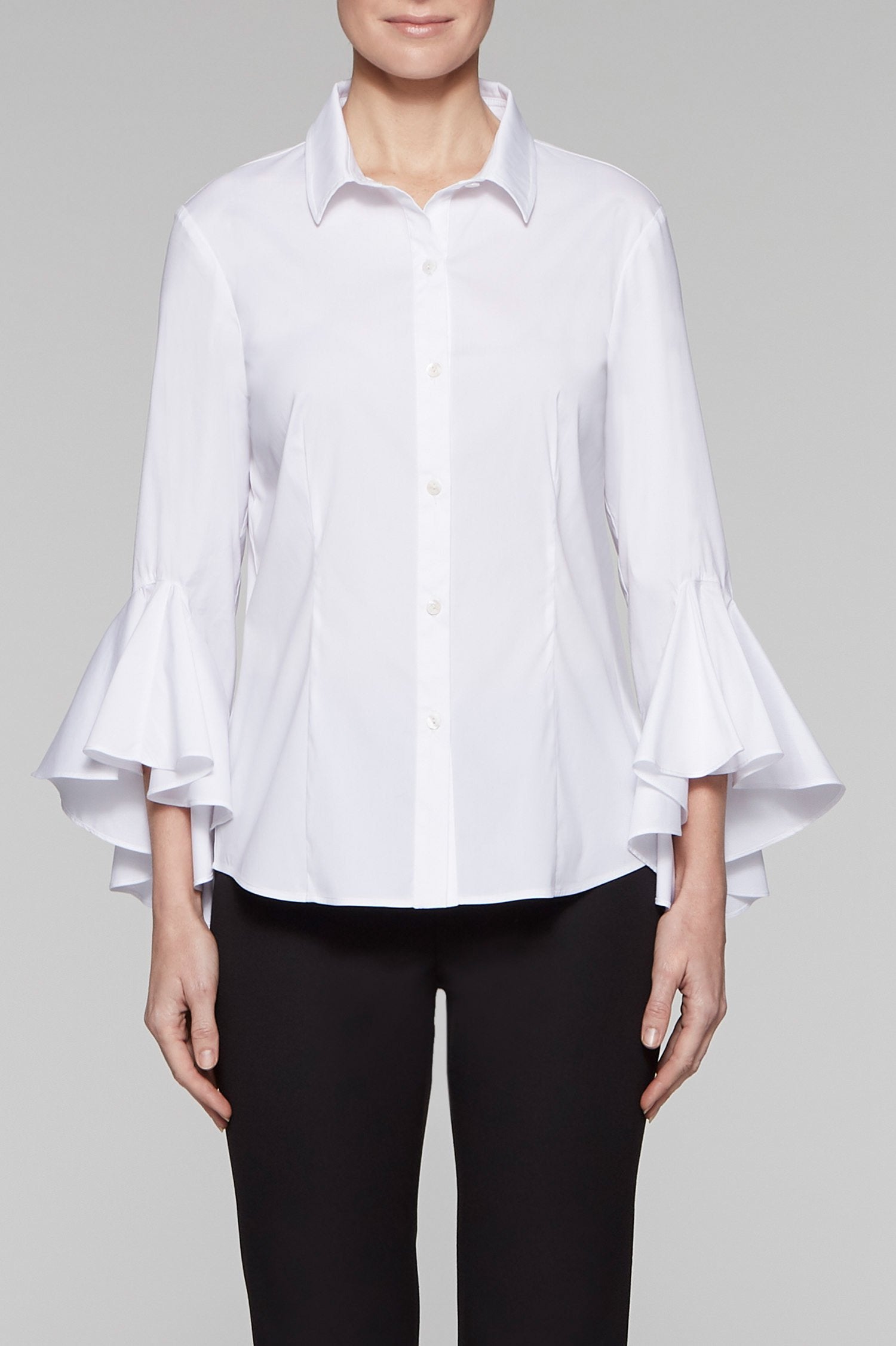 At home and in life, you're known for adding a little flair to the occasion. Our Ruffle Trumpet Sleeve Blouse does the same in a timeless, on-trend way. A flattering construction and flared sleeves pair well with your favorite Ming Wang Basics, from pull-on skits to patterned knit jackets. Wear with boot-cut denim and neutral open-toe booties for a fun weekend-ready look, or add some personality to your office appearance with palazzo pants and a hip-length knit vest.