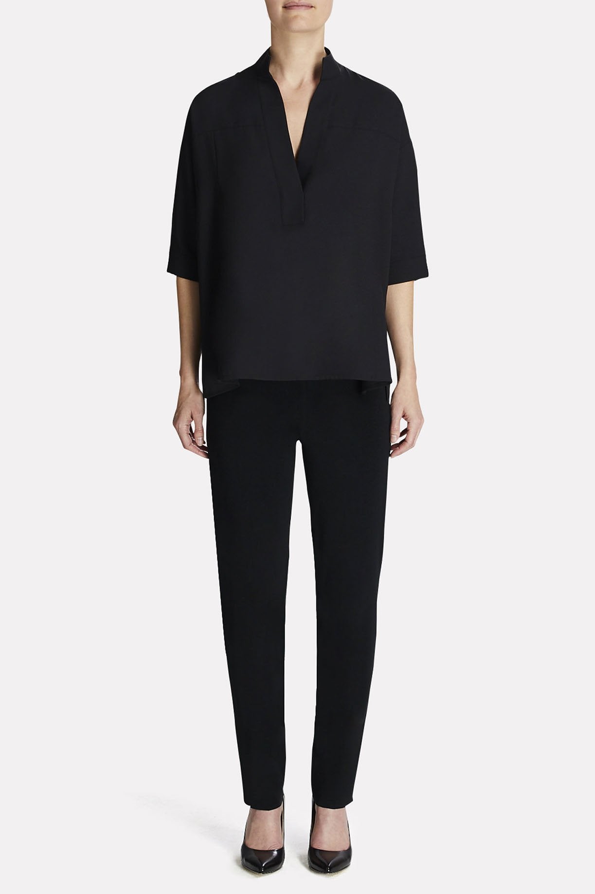 Looking stylish never felt so good. A stand collar adds structure and boldness, while a relaxed fit adds softness and comfort — giving you the freedom to dress this tunic up or down. A hi-lo hem also adds a subtle touch of modernity. Take this top with you on your next flight overseas with a pair of black palazzo pants and sneakers, or wear it while museum hopping with a pair of patterned ankle pants, and comfortable ballet flats.