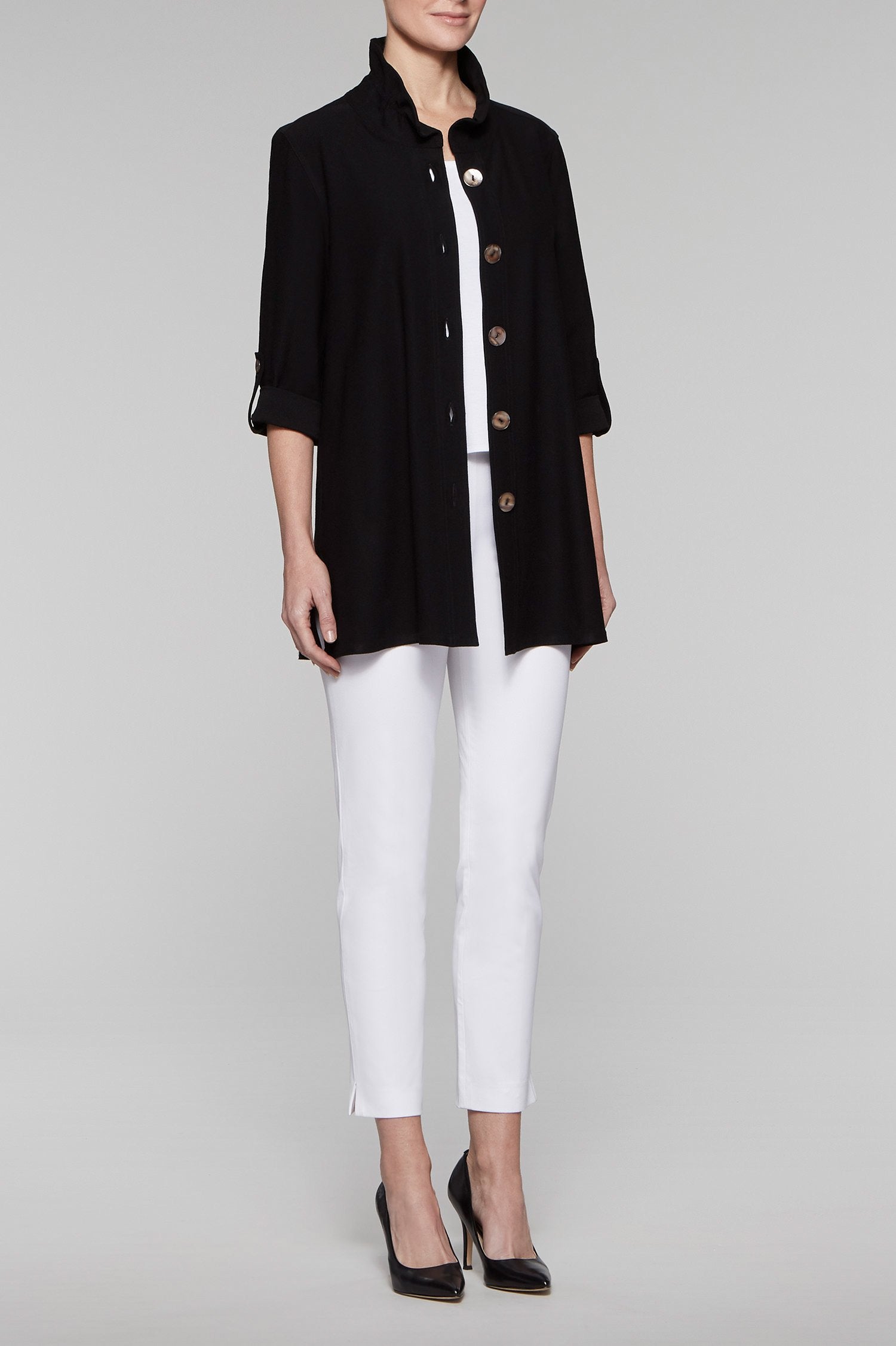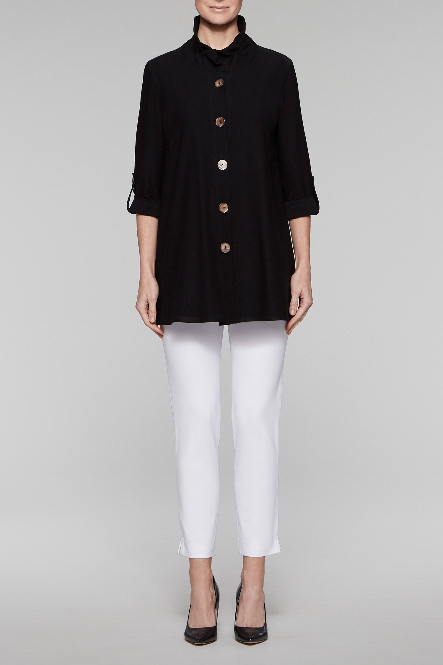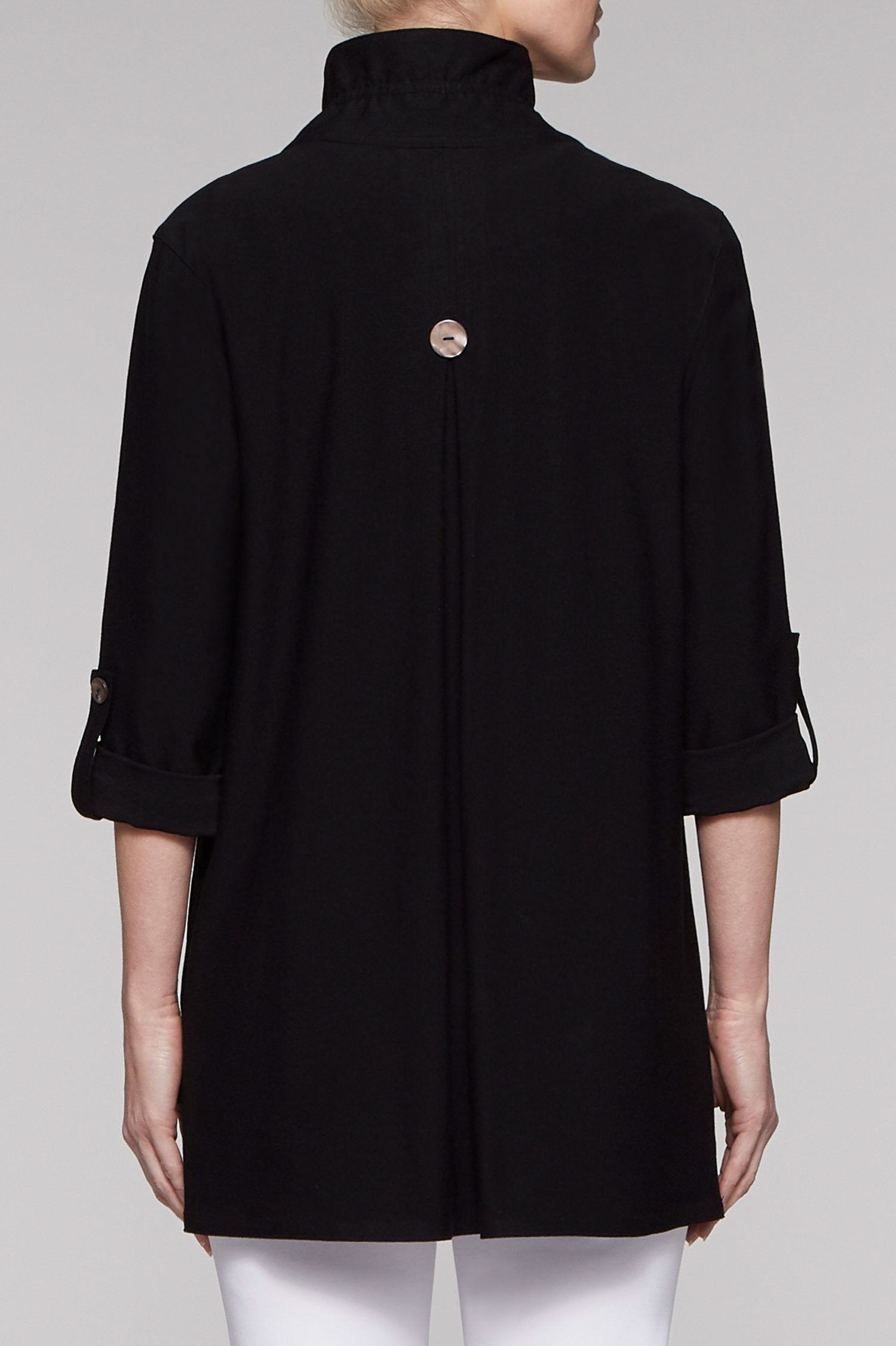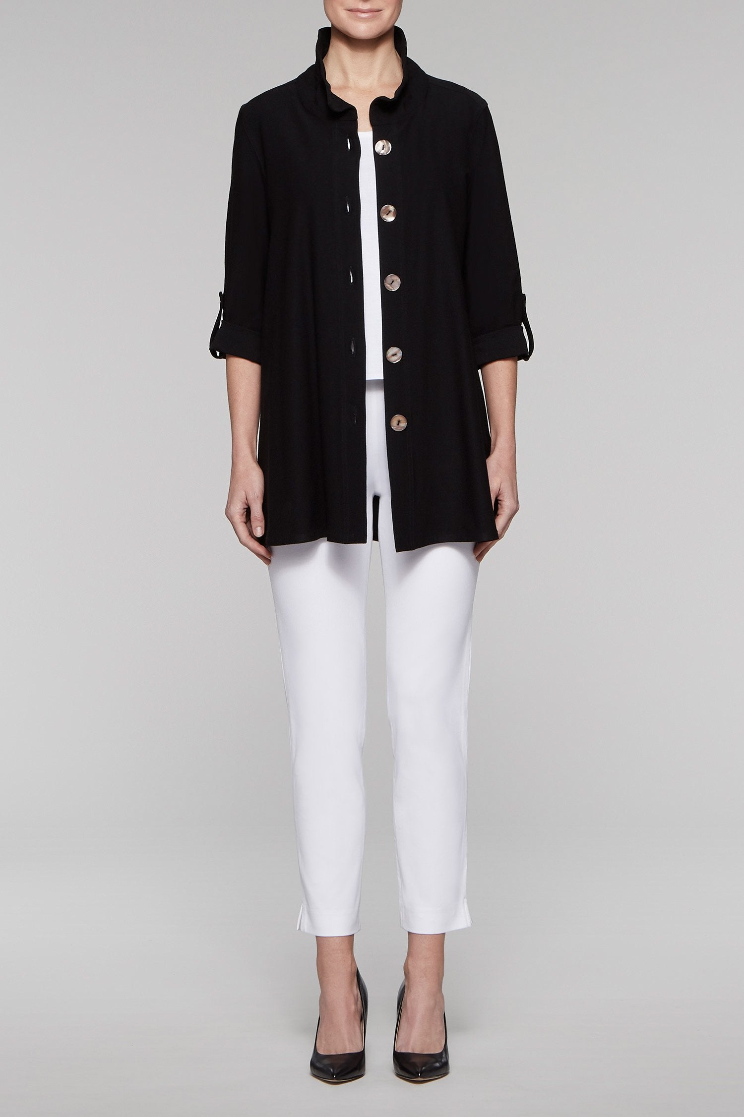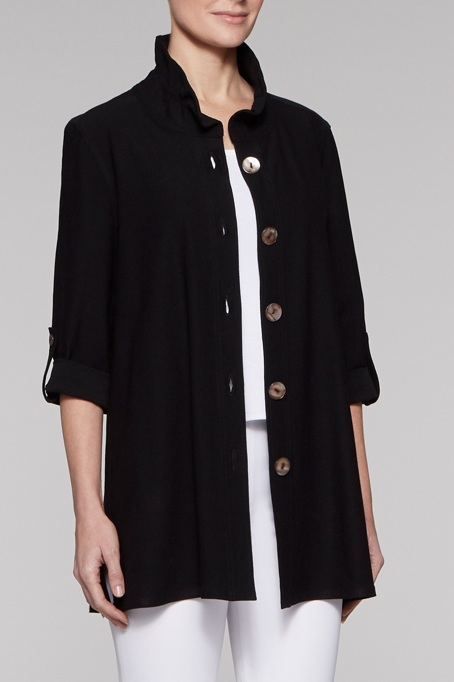 You live your life as an artist, and this studio-inspired jacket adds a little inspiration to your look. Mother-of-pearl buttons down the opening and on the pleated back add a touch of polish to the cozy look. Wrinkle-resistant fabric makes it an ideal choice for layering when exploring out of town. Wear with relaxed denim or neutral pants, a white tank, and canvas shoes for a classic, polished sightseeing look. Or add it to a monochromatic business ensemble to stay cool and comfy when working under pressure.
